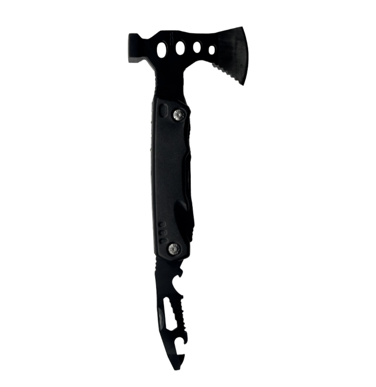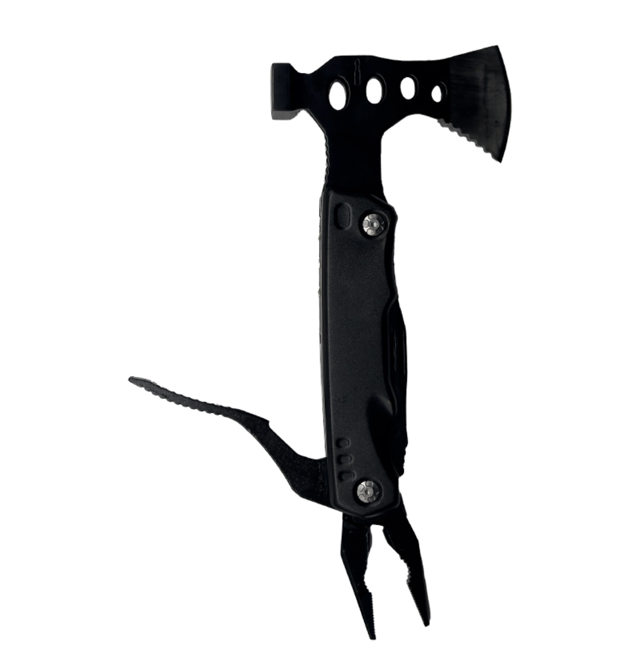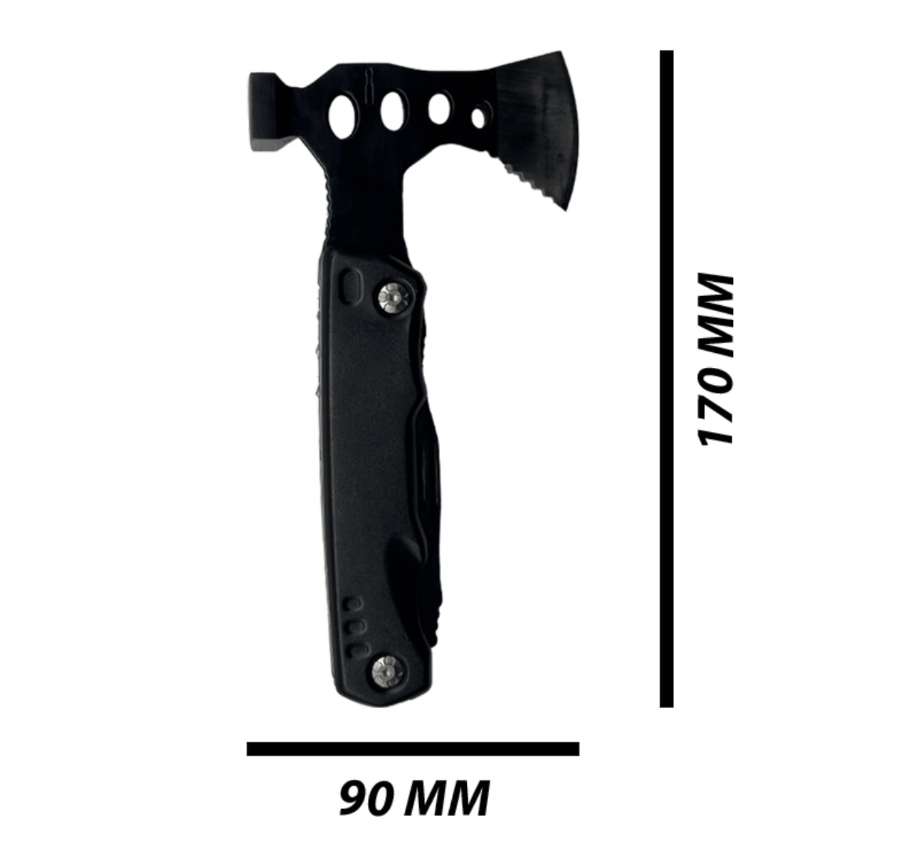 FUNCTIONS: Axe, Head mounting, Hammer, PH2 Cross batch, SL4 5 in one batch, PH1 cross batch, wire scissors, pliers, main knife, bottle opener, serrated knife, hexagon wrench